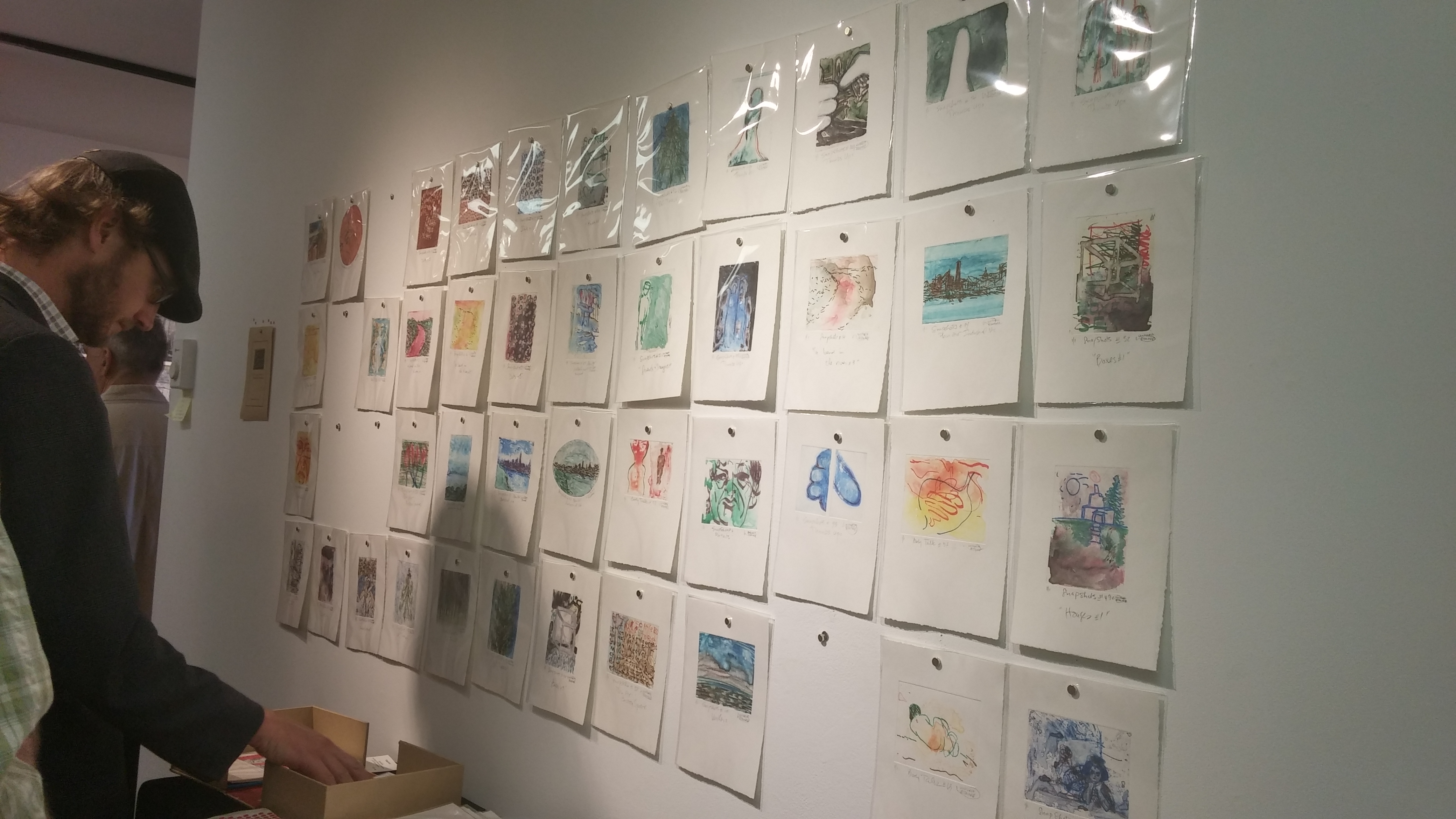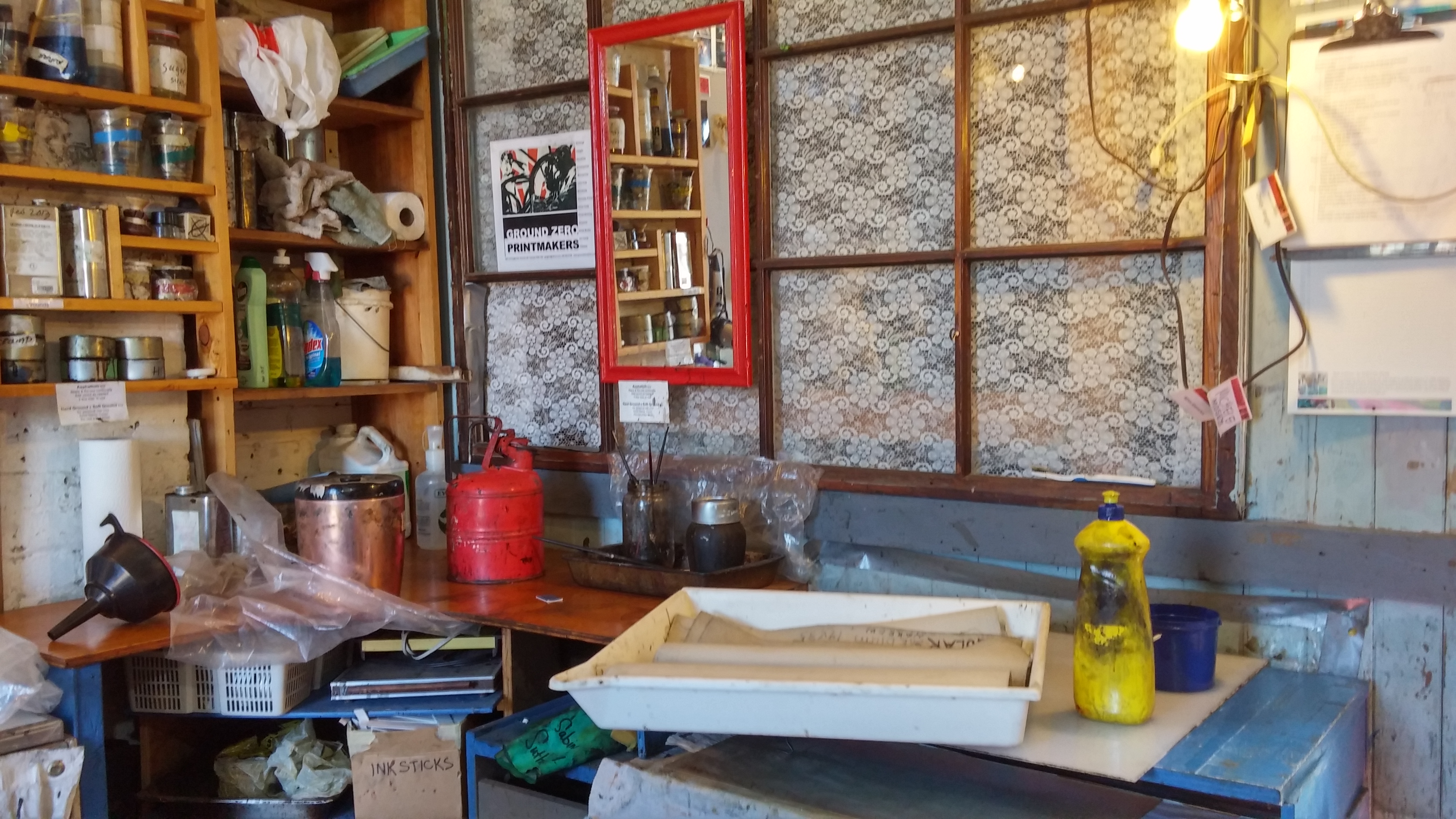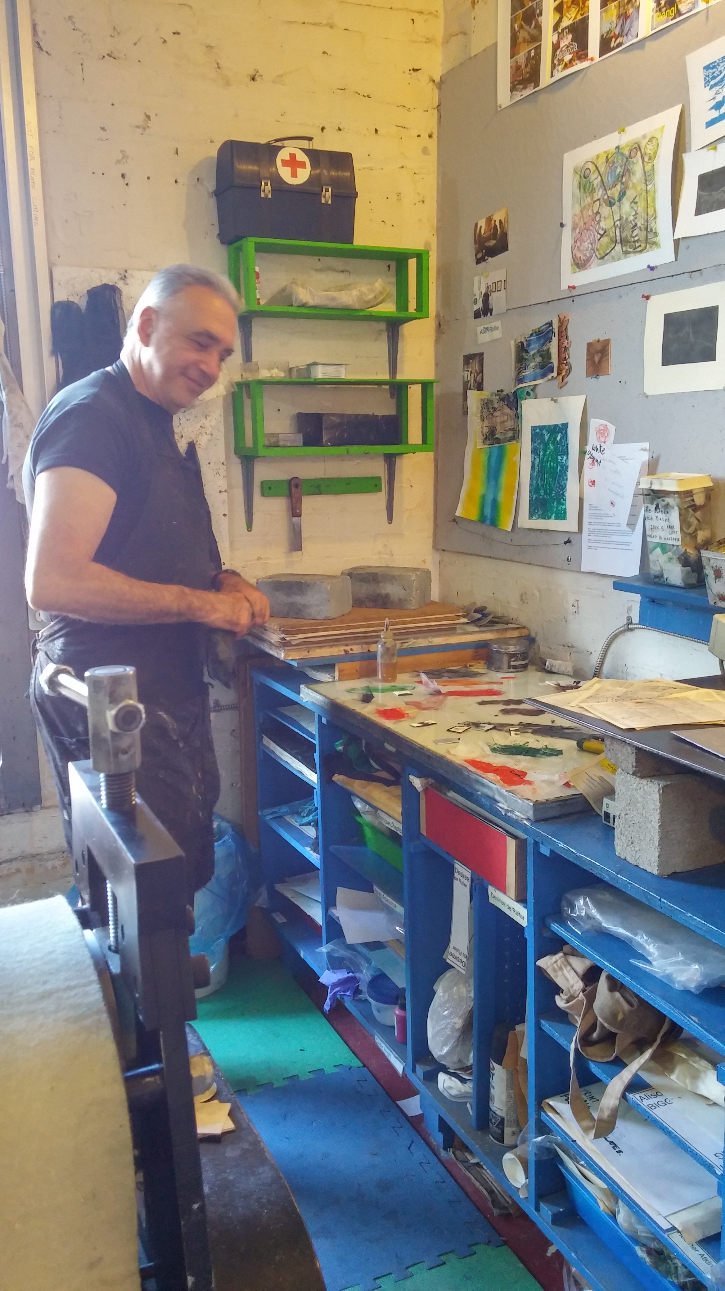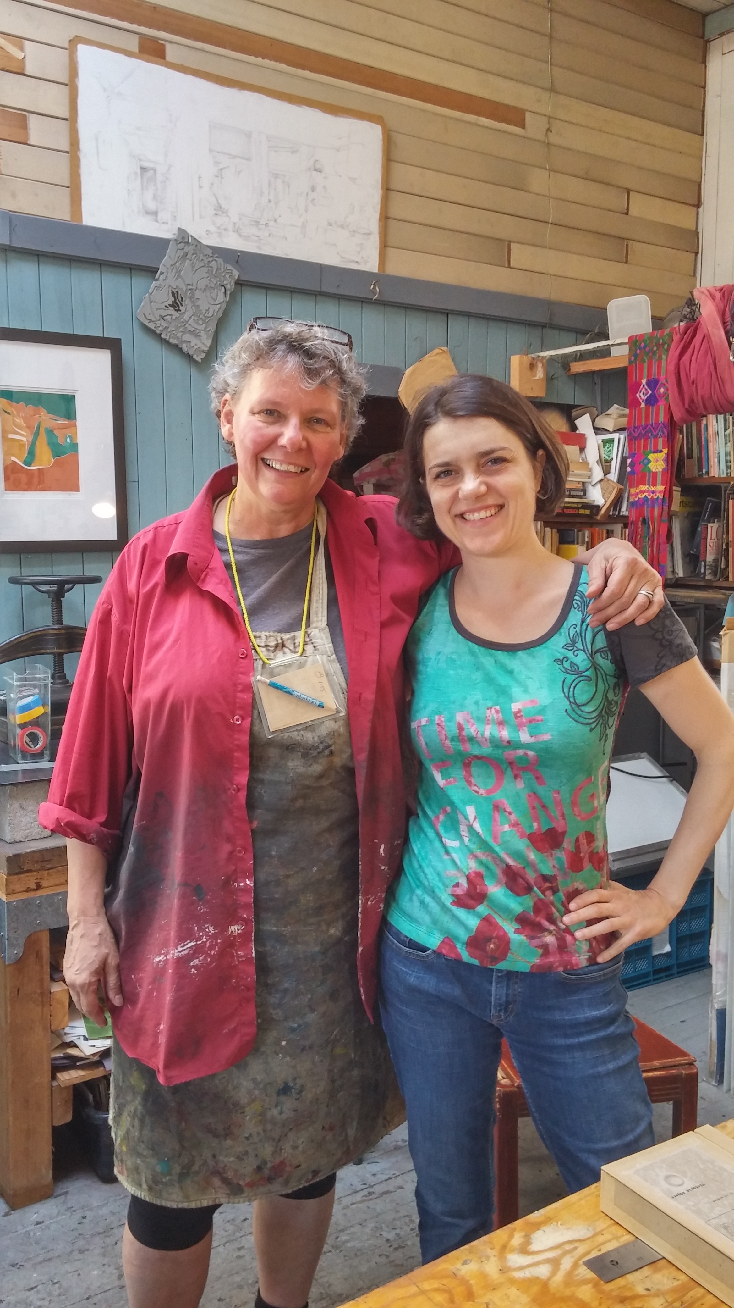 To say the studio has atmosphere is an understatement. This is not something that comes automatically – it takes time to evolve. There’s history everywhere here and the smell of printing inks took me back to my student days at York University. Alain and I happily chat and I grill him about how they first met over 30 years ago at Concordia University as students, while his frieze of clay sculptures eaves-drop from overhead. Miyoko got to learn something about etching techniques (among other things) from Victoria. I will let the pictures speak for themselves. Some can also be found on my Tumblr blog. Miyok will be posting her own blog on their conversation. We will be going back. If you want to take classes check out the offerings at Ground Zero Printmakers where Victoria and Alain are of course master printers and teachers.